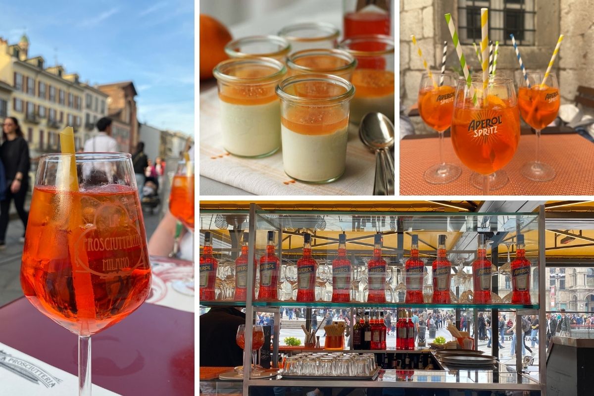 Bildcollage Aperol Spritz und Aperol-Dessert